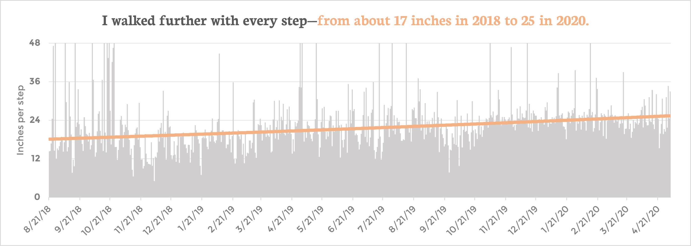 This chart shows my average step length (in inches) every day between August 2018 and May 2020. The orange trendline shoes that my step length has increased by 47%: